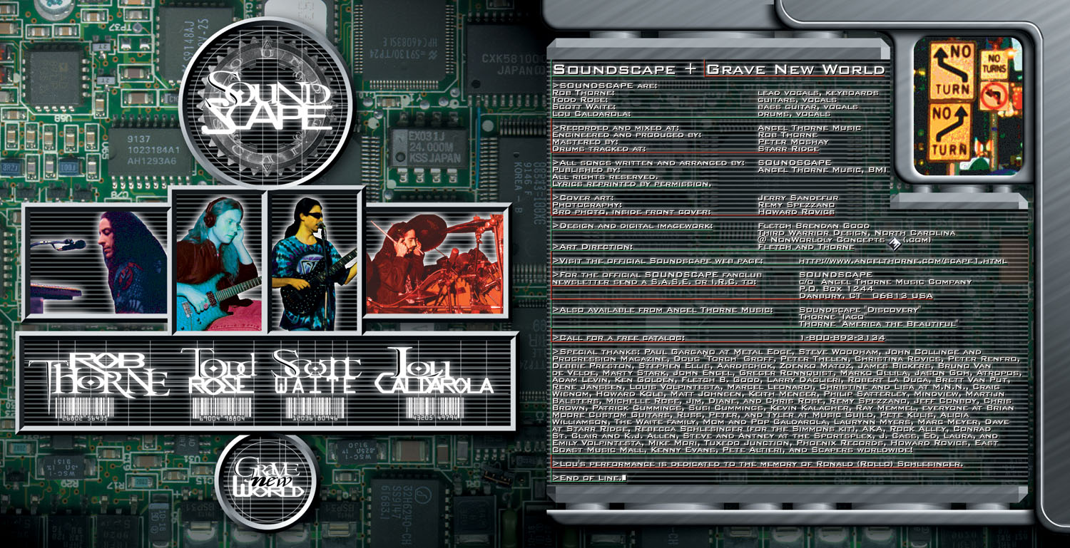 Connecticut prog-metal band Soundscape approached me at the ProgDay 98 festival about doing the CD booklet for the follow-up to their debut album, 1997's Discovery. They were appreciative that I wanted my style of working with a band to be more like that of Hugh Syme or Storm Thorgerson than like Roger Dean- even though I hadn't done a CD before. With that in mind they gave me a test pressing of the CD before they finished the mix, so that I could get a feel for the whole album. Soundscape's keyboardist/vocalist, Rob Thorne, actively described how he wanted the whole booklet to "feel", the image he wanted to project: A society that looked mostly like it does today, but with a slight overshadowing of a technological Big Brother over everything.