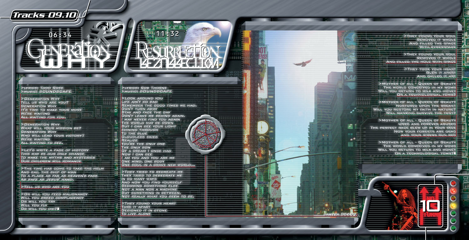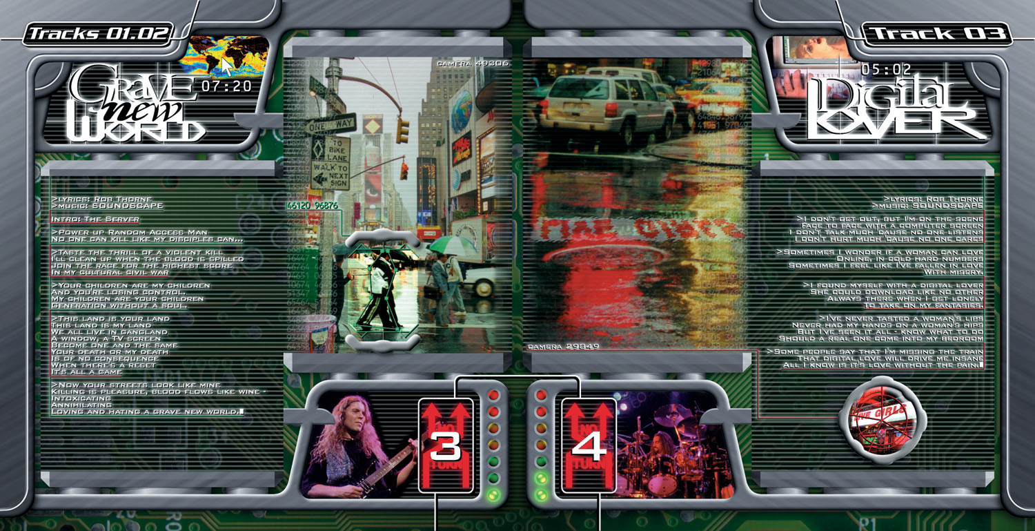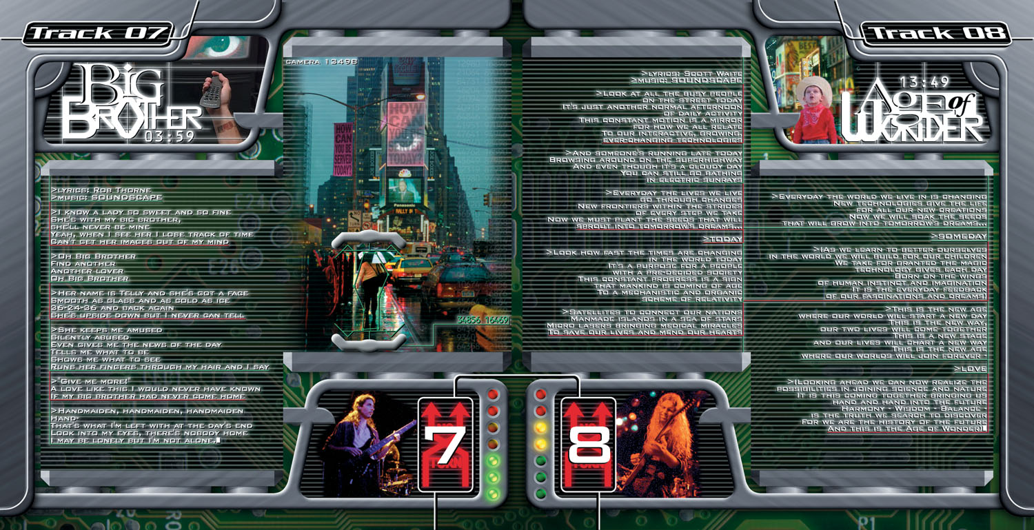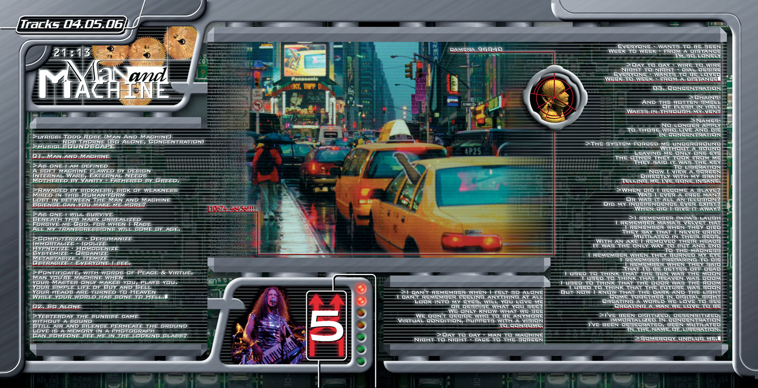 I wanted all the pages of the lyric booklet to have these design elements that showed mechanical/electronic equipment, with the lyrics and photos showing up as images on some kind of display screen. The metal structures framing the screens with the images and lyrics were meant to be animated in a multimedia "enhanced CD" section of the album. I got the idea that overlaying them, semi-transparent, over the raw circuit board background would give the impression of a "Big Brother" entity, either man or machine, that was "cool and clean" and "raw and aggressive" at the same time. The barcode numbers underneath each band member is also a repeated theme in the booklet.