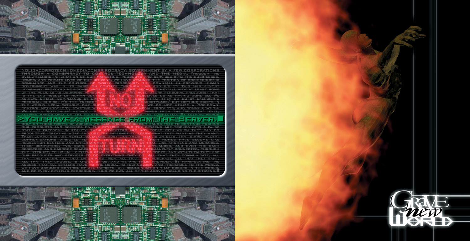The first song "Grave New World" of course sets both the mood and the scene for the whole album, and the illustrative image that accompanies it in the booklet does so as well. The band apologized for the fact that all the location photos were in the rain, but I thought that worked better to give the all the images a more depressing look to them, since Times Square still looks bright at night. I intended for the elements overlaying the photos to look like the "Big Brother" entity was monitoring the public electronically. An element that Rob Thorne particularly liked was the lack of private identity, symbolized by the ten-digit number attached to the man as he crosses the street. You can also see "Big Brother" above the Jumbotron in the background. It was my idea to name him/it "The Server", which I thought had a kind of combination Microsoft/Orwellian feel to it in this context.